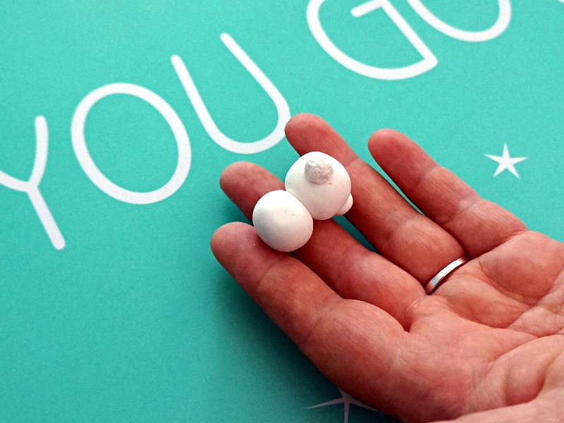 Les yeux et la bouche seront formés par deux petits morceaux de fimo noire délicatement appliqués à l'aide du dotting-tool sur la face avant de la tête.